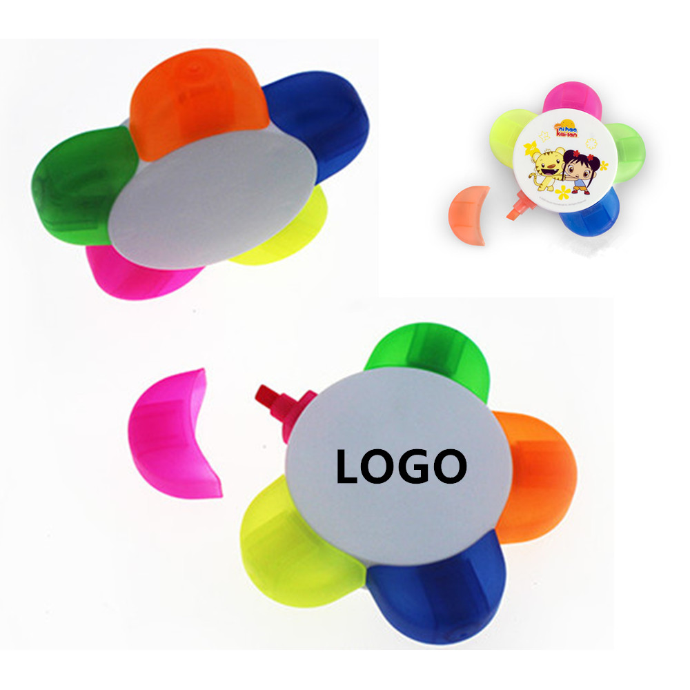 Great for watercolor painting, card making, scrap booking, also good tool to mark. Great for children who are interested in drawing. Cute petals appearance makes it a great gift for kids, fashion girls. Five color in one highlighter: Fluorescent Hot Pink, Fluorescent Yellow, Fluorescent Green, Blue, Orange. Your LOGO or artwork can be imprinted on it.