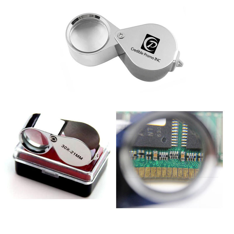 This product is mini, foldable, spacious design. Easy to carry. Surround a chome swivel cover, ending with small loop to attach to neck chain or key-chain. Our min Magnifier Loupe 30xExtremely powerful 30X magnification from optical-quality double glass lenses shows ultra-fine detail. This teardrop shaped folding magnifier is compact in size and has an attractive appearance with chrome plated exterior. You can use it for identify jewelry or finding the smallest of pests on your plants. Comes in a plastic protective case. Your logo can be imprinted on product.