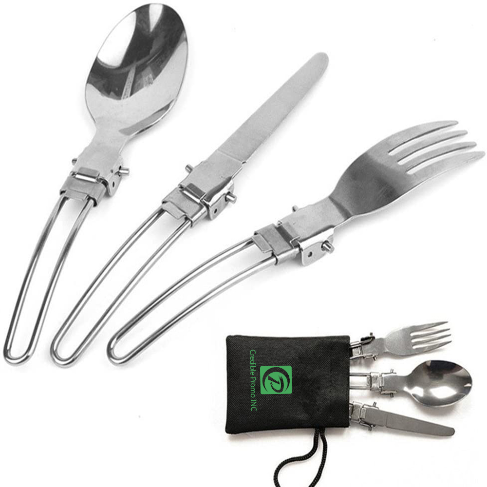 Made of stainless steel, durable and foldable. Item includes knife, fork and spoon, and comes in canvas case. This set of stainless steel tableware, does not occupy space, easy to carry. Great for camping, hiking, hunting, picnic, fishing, barbecue, travel, etc.
