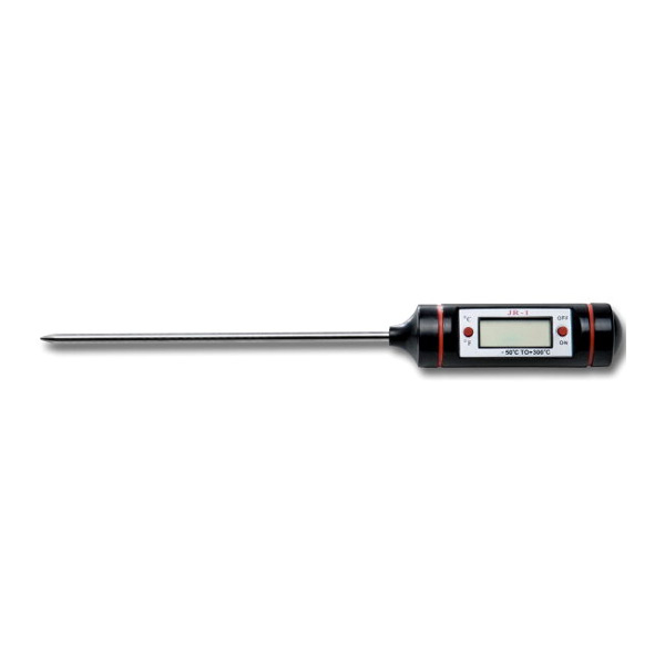 Digital BBQ Thermometer or food thermometer. Your great partner when go camping or picnic, suit to test the temperature of milk, bathtub water, experiment items and so on. Switch between F-Fahrenheit and C-Celsius. Temperature range (F: -58 to +572 or C: -50 to + 300). Memory of last measuring. Saving power: auto-off after 15 minutes of no-operation. Made from ABS and stainless steel. Size is 8.1"x0.78".