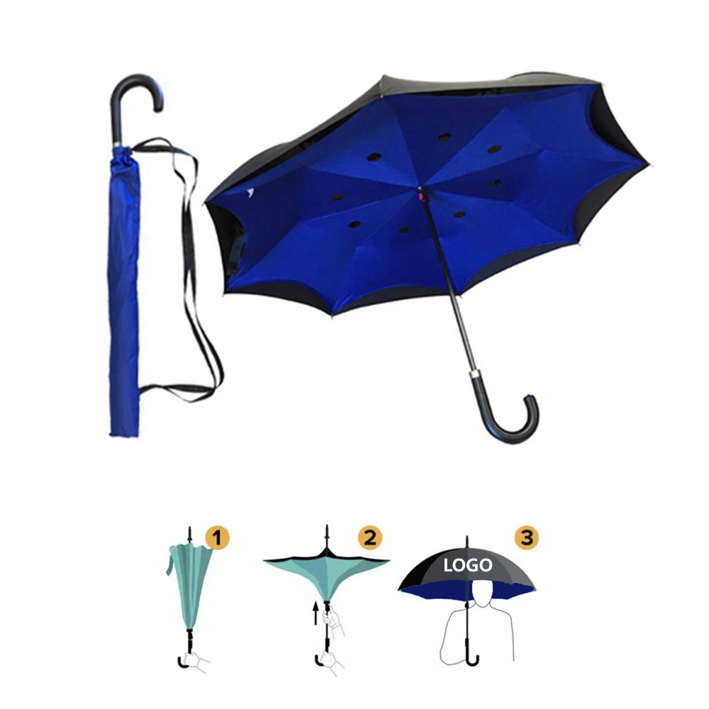 This J shape reverse umbrella is made of double layer pongee cloth and flexible fiberglass ribs which can be restored from a 180degree bend, very sturdy and durable. Inside-out design solves multi frustrations in rainy day. The dry side of the umbrella will come outside and the wet side will come inside when it was closed. We have both C-Type and J-Type handle. Any logo custom is supported.