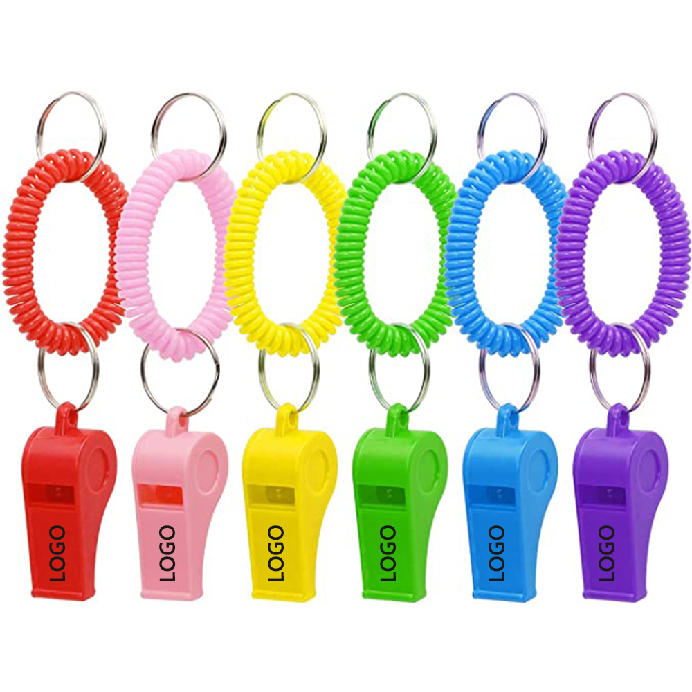 | Feature : | Loud Clear Plastic Whistles with Stretchable Coil Wrist Keychain Ring |