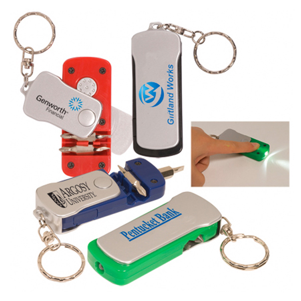 This Mini Screwdriver Set With Led Light includes: Swivel tool to access key light or screwdriver, replaceable button cell batteries inserted and 2 nibs with phillips and flathead screwdriver heads and key ring.