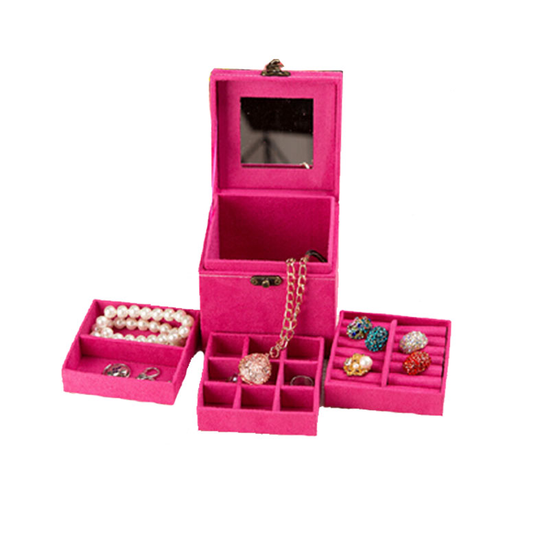Mini jewelry box, made from velvet or suede fabric, with mirror inside. Size: 4.8"x4.8"x4.7". Three layers design, multi compartments on each layer. Well collect your rings, necklaces, earrings, bracelets, etc. Your logo can be imprinted on the outside of box.