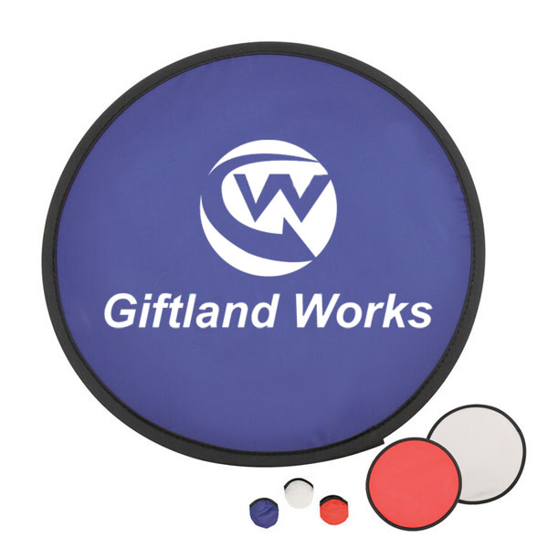 Nylon flying disc, collapsible and foldable. Includes matching compact storage pouch that fits easily in your pocket, purse, backpack. Unit price includes a one color imprint on one side and on the pouch. Great promotional item for sporting events, family reunions, giveaways, trade shows, and fund raisers.