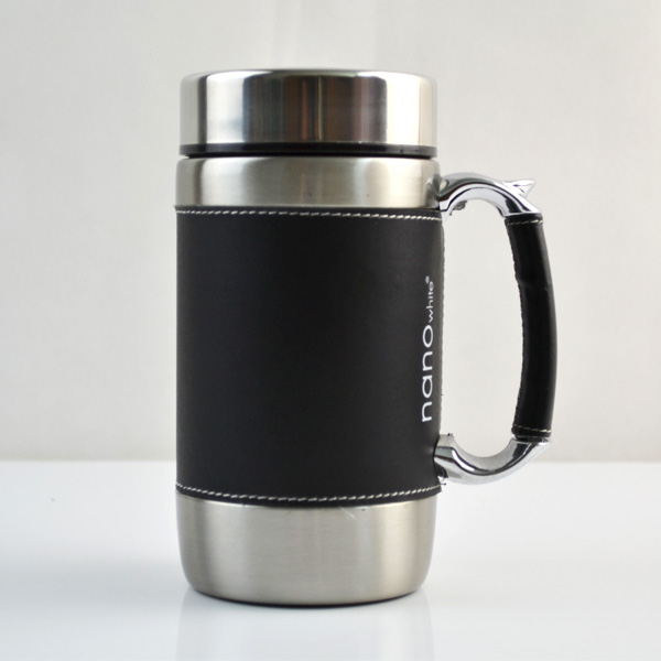 This high quality office mug is made from stainless steel and PU leather. Double layers and thumb grasp design, thermal insulation. Volume is 450ML/16OZ, with a stainless steel filter inside (This filter is better for coffee or tea, you can easily remove it if you don't need it). Your company LOGO can be debossed or silkscreen imprinted on the PU leather.