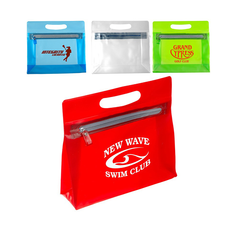PVC pouch with zip locking closure. Top die-cut handle for easy carry. Convenient expandable gusset. The price is based on 9.5"Wx8.3"Hx2.4"D. You can also custom other size you want. And your LOGO or artwork can be imprinted on the bag.