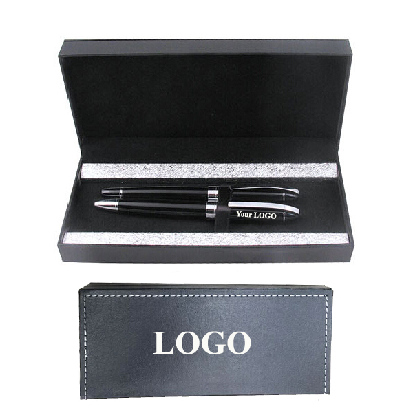 High Quality Pen Set, including one roller point pen, one ballpoint pen, and one gift case. Both pens are made of steel and copper. Handsome rich enamel black and shiny chrome silver finish. Your LOGO can be laser engraved or silkscreen imprinted on the pens, or silkscreen imprinted on the outside of gift case.