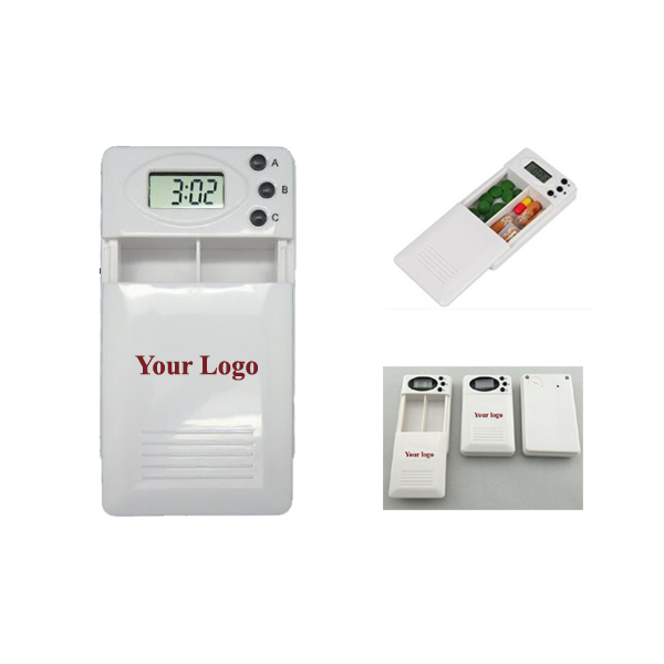 This new pill box can hold pills, and time can remind, guarantee you can take the medicine on time, its size 3.4"x2.1"x0.7",Time can be set arbitrarily , it also can be used for date, cooking, sleeping, tourism and other activities, the large imprint Area welcome your logo.