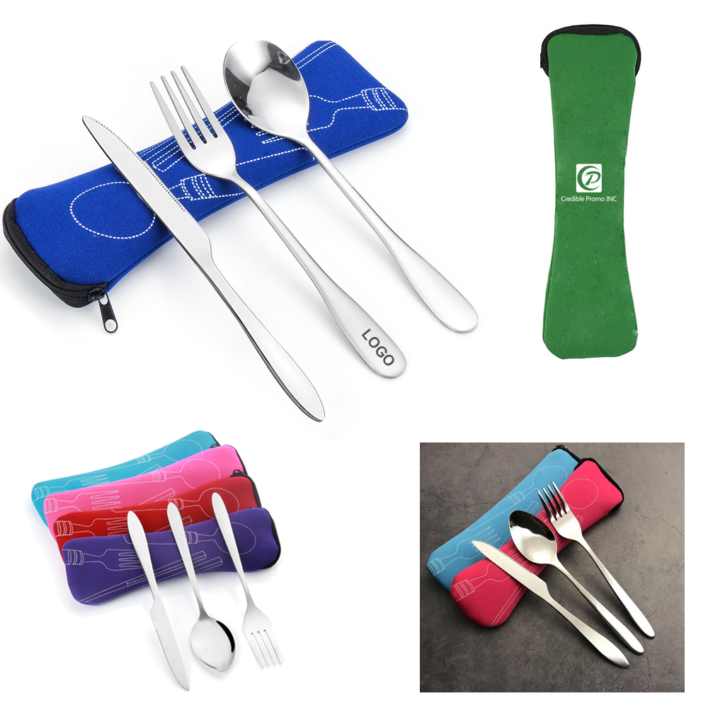 Made from 410 stainless steel, this cutlery spoon set includes a knife, a fork and a spoon. Come into a customized neoprene case, durable and reusable. Lightweight compact to fit in your backpack, office drawer, lunch bag or car. Handy for students, office work, camping and traveling. Say no to flimsy disposable plastic! Custom silkscreen printing LOGO on the case and engraving LOGO on the cutlery sets. Price below is for silkscreen printing LOGO on case.