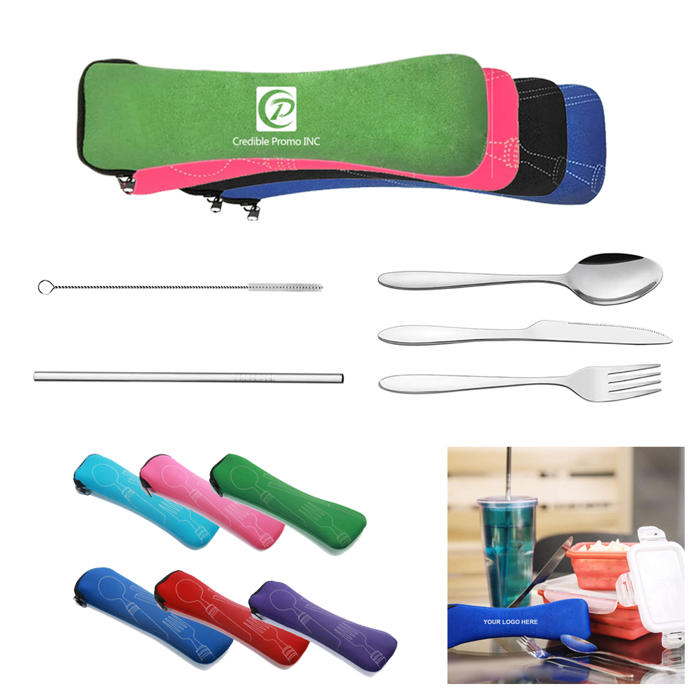 Made from food grade 304 stainless steel material, this cutlery sets includes a knife, a fork, a spoon, a straw and a straw brush. Come into a customized neoprene case, lightweight caompact to fit in your backpack or lunch bag. Perfect for office work and outdoor activities. Custom silkscreen printing LOGO on the case and engraving LOGO on the cutlery sets. Price below is for silkscreen printing LOGO on case. Say no to flimsy disposable plastic and take this portable cutlery sets for your travel and camping!