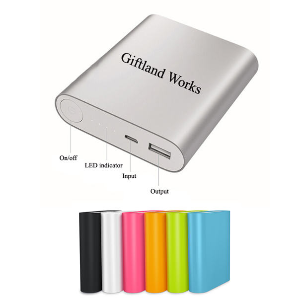Aluminum power charger or power bank with LED volume status indicator , size is 3.5"x3.03"x0.83". Let's enjoy the aluminum's quality smooth surface. The volume is 8000 mAh. It's the suitable size to put it into your bags, ideal and popular promotional item. Can charge most of your portable electronic devices such as i Phone, i Pod, Samsung phones, Android smart phones, regular mobile phones, digital cameras, etc. Each full loading can charge your I phone 4 or 5 around four times. Recharge more than 500 times. Many colors and your customized LOGO is available.