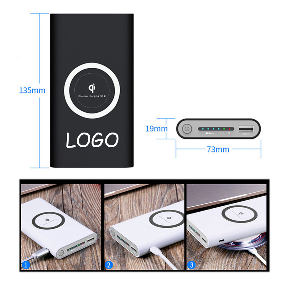 10000mAh charger power bank, wireless input and output: 5V/2.1A. It works with most the latest phones that have built in wireless charging capability. The lithium battery can handle Qi and non-Qi enabled devices with USB connections. Have Micro and Type C input port, and a USB cable to the device port for optional wired charging.