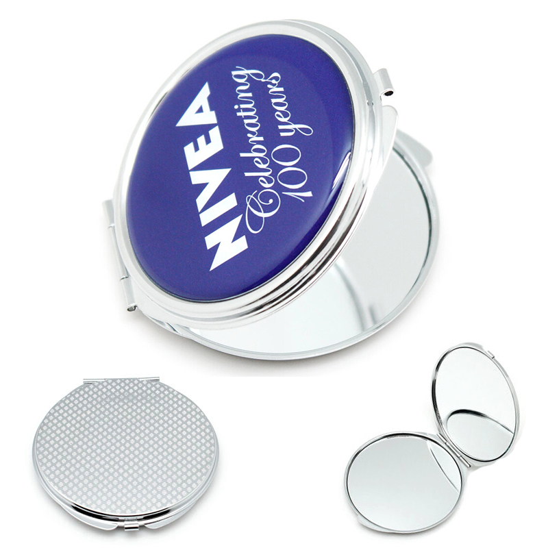 Custom high quality foldable cosmetic mirror. Round shape, double mirrors inside, easy opening. Pocket size: 2 3/8" X 2 3/8". Non-slip bottom design. Chrome plated metal surface. All material safety tested. Your artwork can be epoxy imprinted on the upside of lid. Hot sale on US market !