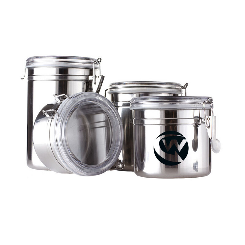 Kitchen airtight canister set, made from stainless steel and acrylic lip. Including 4 canisters (Each diameter is 5 inches): 900ML/31.8OZ, 1200ML/42OZ, 1500ML/53OZ, 2000ML/70OZ. Content visible with this clear acrylic lid. Easy press locking clamp design. Airtight, dampproof, fresh-keeping, easy cleaning. Great to save coffee beans, nuts, candy, oatmeal, milk powder, tea, sugar, and other food.