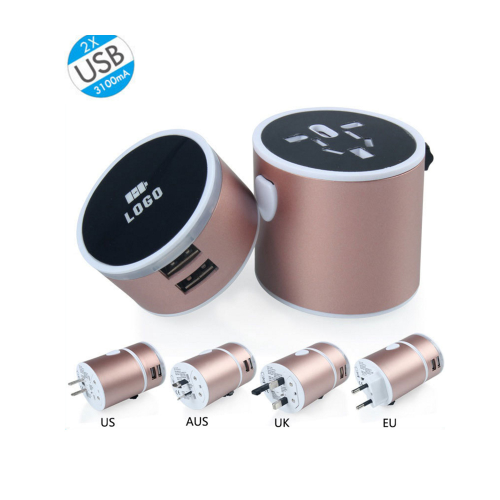 There are four sockets: US, UK, EU, AUS. Double USB output maximum electricity 3.1A each. Quality passes through CE, RoHs and FCC Certification. Your Logo can be imprinted with back light effect. Small size is portable to carry in your travel.