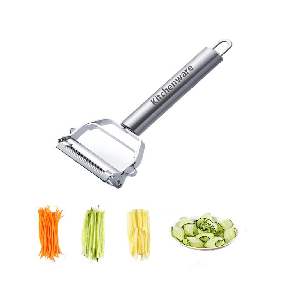 This kitchenware julienne peeler come with the highest quality stainless steel blads. One side for regular peeling and the other for making julienne strand and you can also use this tool to remove potato eyes. Peeling potato, carrot, zucchini, cucumber, beet, pumpkin, radish, parsnip, sweet potato, apple and other veggie just easier with our ultra sharp peeler slicer.