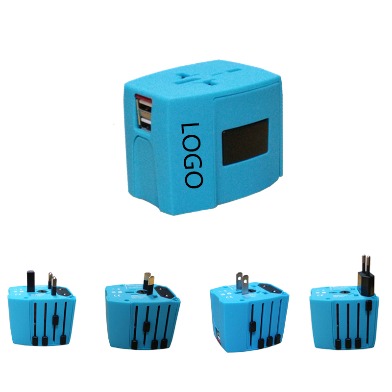 Universal travel adapter or plug with 2 USB ports, 4 plugs build-in one. It's a small pocket-sized power adapter set for go-anywhere convenience. This all-in-one unit provides plug adapters for use in more than 150 countries, such as USA, UK, EU, AUS, Asia and so on. So you never need to be at a loss for power again. With CE & Rohs certificate. Thunderstrike protection. Can charge your phone and tablet PC at the same time. Rated voltage 110-240 V/AC, Rated current: 10 A. Your LOGO can be imprinted on it.