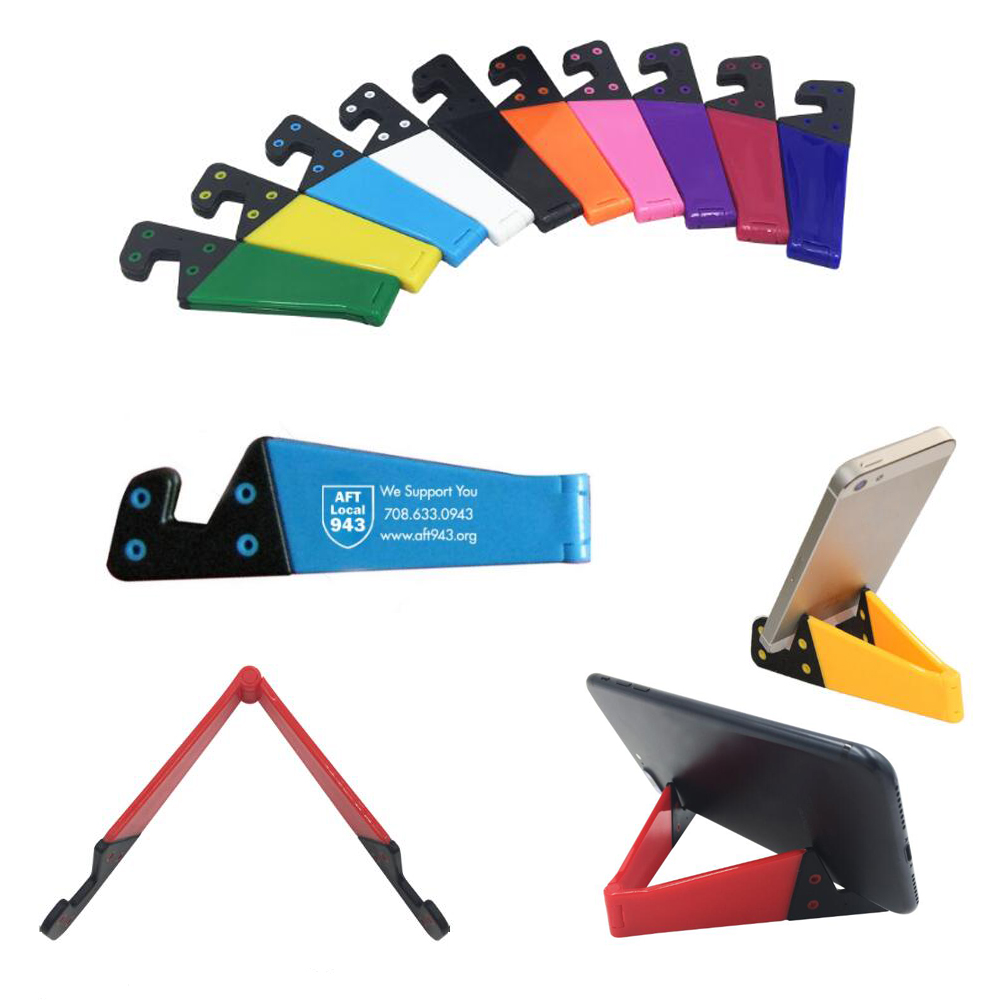 Our V shape phone holder has maximum opening length 5.5", suitable for 7-10 inch cell phone or pad. Free your hands when you are watching movies or TV shows. Adjust the opening angle to allow the phone to be placed horizontally or vertically. PP+TPR material makes it light and portable. Your LOGO can be imprinted on it.